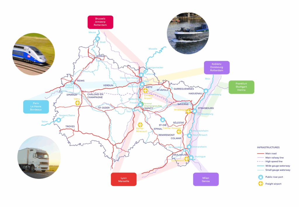 - A zone representing 20% of Europe’s GDP can be reached within half a day’s road transport from Eastern France