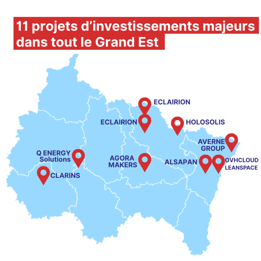 Le 17 novembre 2025 , 11 grands projets d’investissement ont été annoncés en Grand Est. A eux seuls, ils représentent 5,7 milliards d’euros, soit environ 18,7 % de l’ensemble des investissements nationaux en France en 2025, alors que le PIB de la région ne représente que 7 % du PIB national. Ces résultats place le Grand Est au 2e rang national pour les projets d’investissement nationaux et au 1er rang pour les nouveaux investissements. Cette belle performance est due à la diversité des entreprises innovantes qui ont prévu de s’implanter et de se développer dans la région.