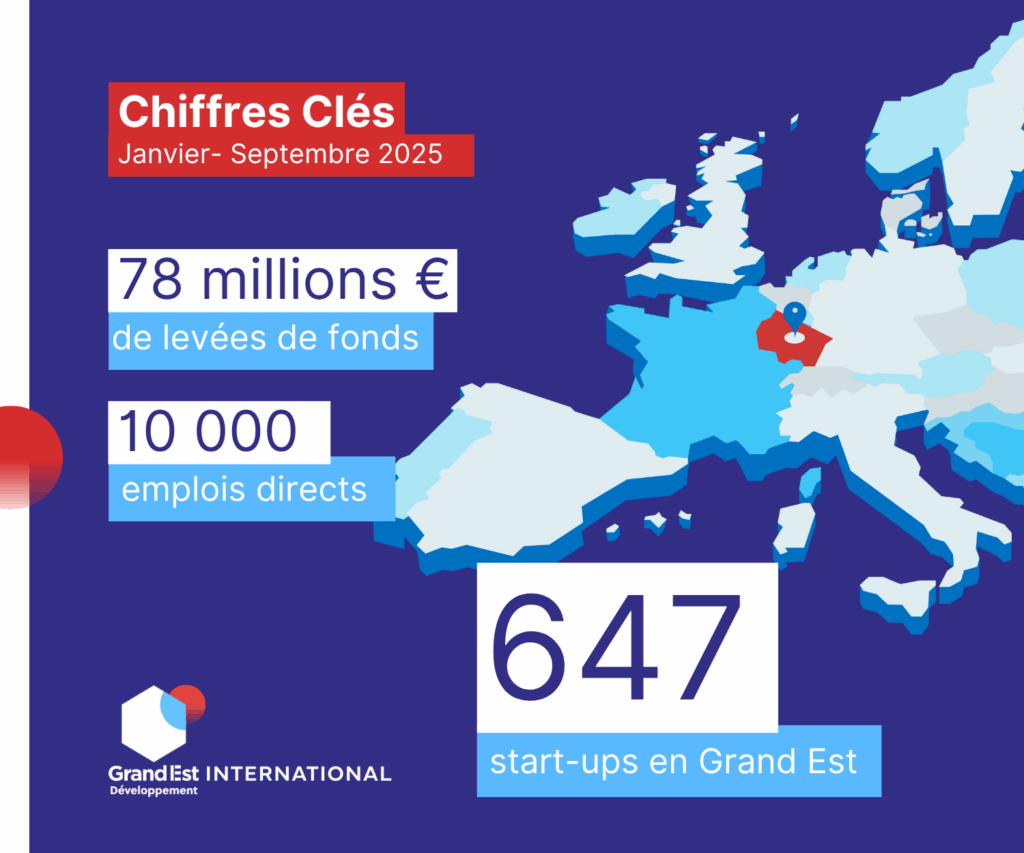 Plus précisément pour la région Grand Est : l’écosystème compte 647 start-ups et 10 000 emplois directs, avec une croissance de l’emploi de +6 % au premier semestre 2025, la plus forte de toutes les régions françaises. De janvier à septembre 2025, les start-ups du Grand Est ont pu lever 78 millions d’euros de fonds !